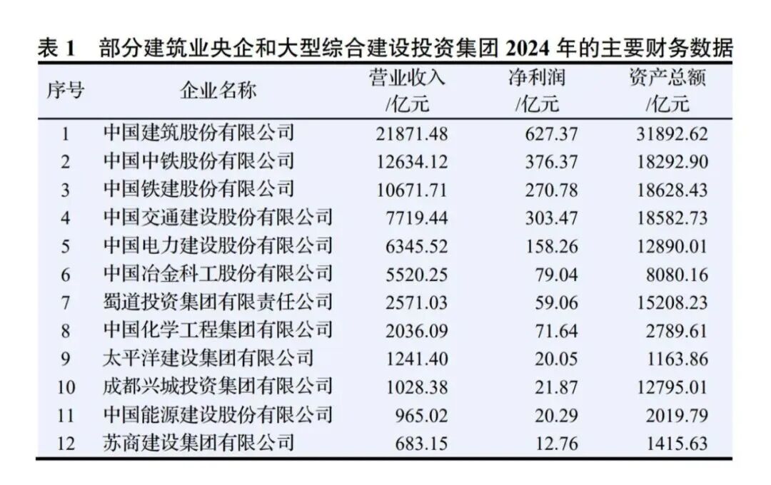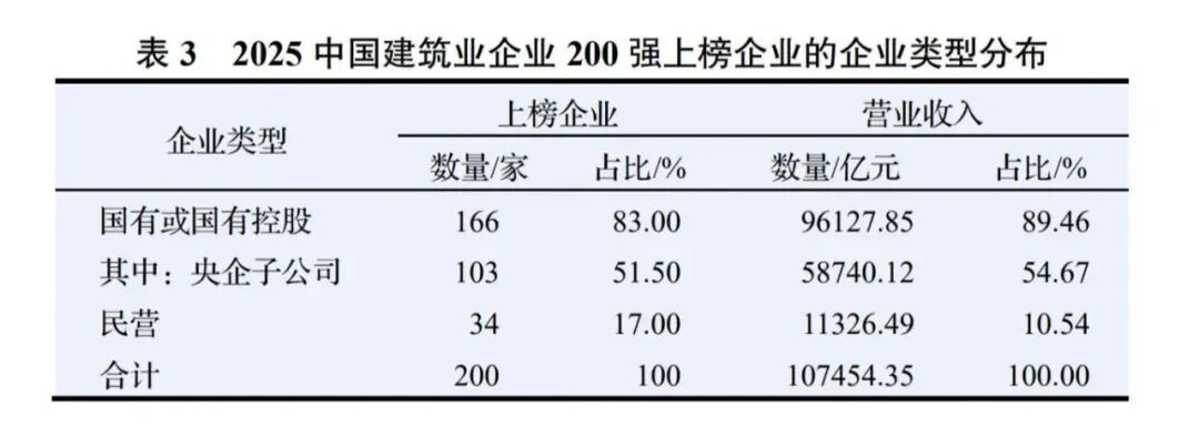 建筑业企业是从事建筑产品生产和经营的经济实体,是建筑生产力发展和建筑技术进步的主导力量。建筑业企业的发展状况如何,对建筑业的持续、健康发展具有重要的影响。有鉴于此,中国建筑业协会建筑业高质量发展研究院、工程管理学报和北京中建协兴国际工程咨询公司联合组成的建筑业大数据应用研究课题组,从2023年开始开展了中国建筑业企业200强的统计分析工作,希望通过这项工作,为我国建筑业企业高质量发展树立标杆、提供指引。 1 研究对象与研究方法 1.1 研究对象 中国建筑业企业200强统计分析的研究对象,主要针对具有施工总承包特级资质的建筑业企业。为保证评价结果的可比性,对入选榜单的建筑业企业设定如下条件: (1)建筑业央企和一些大型综合建设投资集团不纳入榜单范围。为了反映这些企业在建筑业企业中的地位和影响力,表1列出了这些企业在年报或可信渠道公开披露的主要财务数据。 ![]() (2)如果备选企业属于建筑业央企子公司,则只选择一级子公司,一级子公司下属的各层级子公司不纳入对比分析的范畴。 (3)各省级建设(建工)集团,其下属的各层级子公司不纳入对比分析的范畴。 (4)进入榜单企业对其控制企业的投资比例如超过50%,则被控制企业不能入选榜单。 (5)能够从企业年报或可信渠道获得企业的主要财务数据,且入选榜单企业2024年的营业收入不少于100亿元或“营业收入不少于50亿元且净利润不少于1亿元”。 (6)企业经营状况正常。企业在上一年度未发生较大以上安全、质量责任事故和有重大社会影响的企业失信事件、违规招投标事件、违法施工事件、企业主要领导贪腐案件等。 满足上述条件的建筑业企业共有256家,本文分别对其中营业收入排在前200家、净利润排在前200家、资产总额排在前200家的企业进行分析。 1.2 数据收集方法 本文研究分析所用数据,全部通过企查查(www.qcc.com)或天眼查(www.tianyancha.com)获得,确保了分析数据的客观性和公正性。 2 2025中国建筑业企业200强榜单及分布 2.1 2025中国建筑业企业200强榜单 根据满足入选条件的256家企业的营业收入数据,得到入选2025中国建筑业企业200强榜单的各个建筑业企业所在的位次,如表2所示。从表中可以看出,2025中国建筑业企业200强的实际入门门槛是企业营业收入121.56亿元,比2024年的入门门槛降低了0.89亿元。 ![]() 根据国家统计局的统计数据,我国建筑业企业2024年的营业收入为26.40万亿元。2024年,我国有资质等级的施工总承包和专业承包企业有167871家。中国建筑业企业200强仅占总数量的0.12%。但这200家企业的营业收入达到了10.75万亿元,占建筑业企业2024年营业收入的40.72%,比上一年度提高了1.56个百分点。中国建筑业企业200强对建筑业产业规模的贡献度非常明显。 2.2 2025中国建筑业企业200强分布情况 2.2.1 地区分布 2025中国建筑业企业200强上榜企业数量的地区分布如图1所示。从图中可以看出,上榜企业分布在27个地区。北京由于首都所独有的总部基地优势,以上榜34家企业位居榜首;江苏多年来一直领跑全国建筑业,以上榜25家企业位居次席;湖北、上海、四川和广东分别以上榜15家、14家、13家、13家分别排在第3位、第4位和第5位(并列)。这6个地区上榜的企业数量占建筑业企业营业收入200强的57.00%。 ![]() 2025中国建筑业企业200强上榜企业营业收入的地区分布如图2所示。从图中可以看出,北京、上海、湖北、江苏、广东、四川上榜企业实现的营业收入排在前6位,这6个地区上榜企业实现的营业收入占200强入选企业的60.26%。 ![]() 2.2.2 营业收入的分布 从200家上榜企业的营业收入分布看,不同营业收入水平企业的数量分布及其营业收入占上榜企业总营业收入的比重情况,如图3所示。 ![]() 从图中可以看出,入选企业中2024年营业收入超过2000亿元的建筑业企业只有3家,占入选企业总数的1.50%,但其营业收入占到了入选企业总营业收入的11.23%;2024年营业收入超过1000亿元的企业有24家,占入选企业的12.00%,其营业收入占入选企业的38.11%;年营业收入超过750亿元的企业有36家,占入选企业的18.00%,其营业收入占入选企业的47.49%;年营业收入超过500亿元的企业有71家,占入选企业的35.50%,其营业收入占入选企业的67.64%。由此可见,从营业收入角度分析,2024年建筑业企业的集中度非常明显。 2.2.3 企业类型分布 2025中国建筑业企业200强上榜企业的企业类型分布如表3所示。 ![]() 从表中可以看出,2025中国建筑业企业200强榜单中,国有或国有控股企业占据了83.00%的席位,比上年增长了6.00个百分点;其实现的营业收入为9.61万亿元,占200强企业全部营业收入的89.46%,比上年增长了2.48个百分点。其中,央企子公司占据了51.50%的席位,比上年增长了4.50个百分点;贡献了54.67%的营业收入,比上年增长了1.92个百分点。民营企业占据了17.00%的席位,比上年减少了6.00个百分点;营业收入贡献仅为10.54%,比上年减少了2.49个百分点。 3 企业盈利能力200强榜单及地区分布 3.1 2025中国建筑业企业盈利能力200强榜单 根据满足入选条件的256家企业的净利润数据,得到入选2025中国建筑业企业盈利能力200强榜单的各个建筑业企业所在的位次,如表4所示。 ![]() 2024年我国建筑业企业实现利润总额为6455.70亿元。2025中国建筑业企业盈利能力200强上榜企业实现净利润2217.75亿元,占建筑业企业2024年实现利润总额的34.35%,占建筑业企业2024